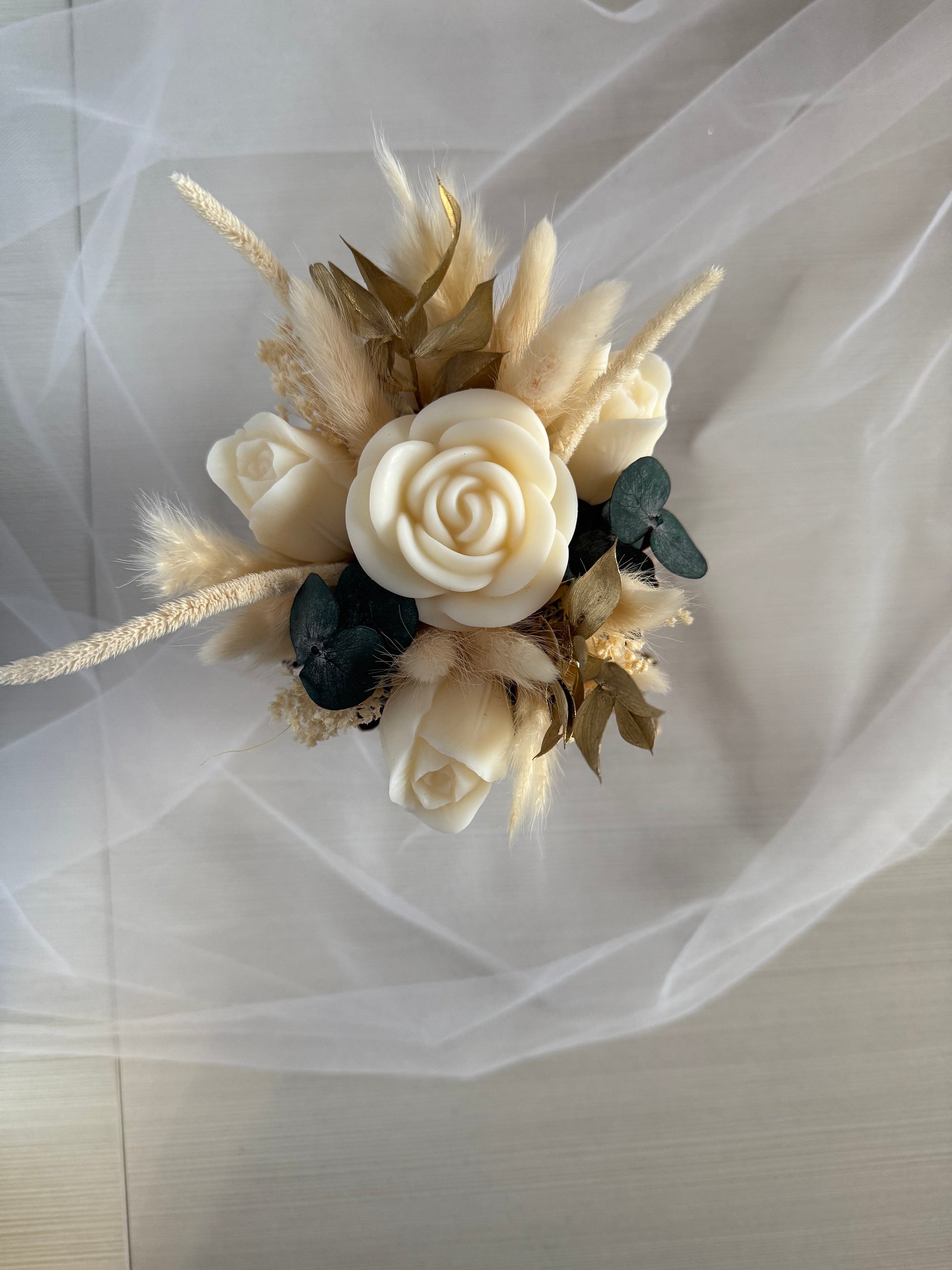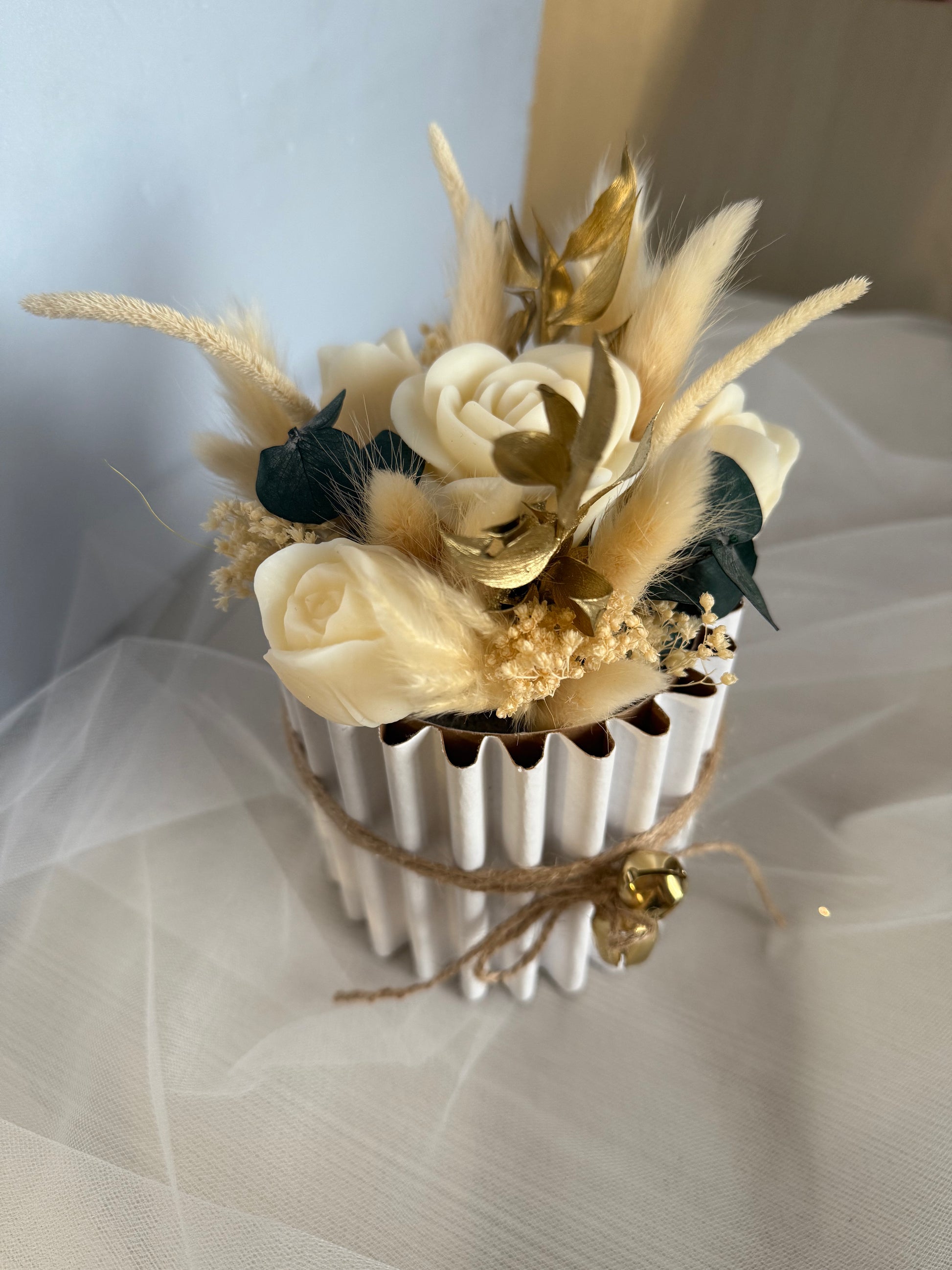 Bouquet Profumato, con base, con fiori ed elementi realizzati in cera vegetale profumata, il tutto completato da fiori essiccati e/o stabilizzati.
