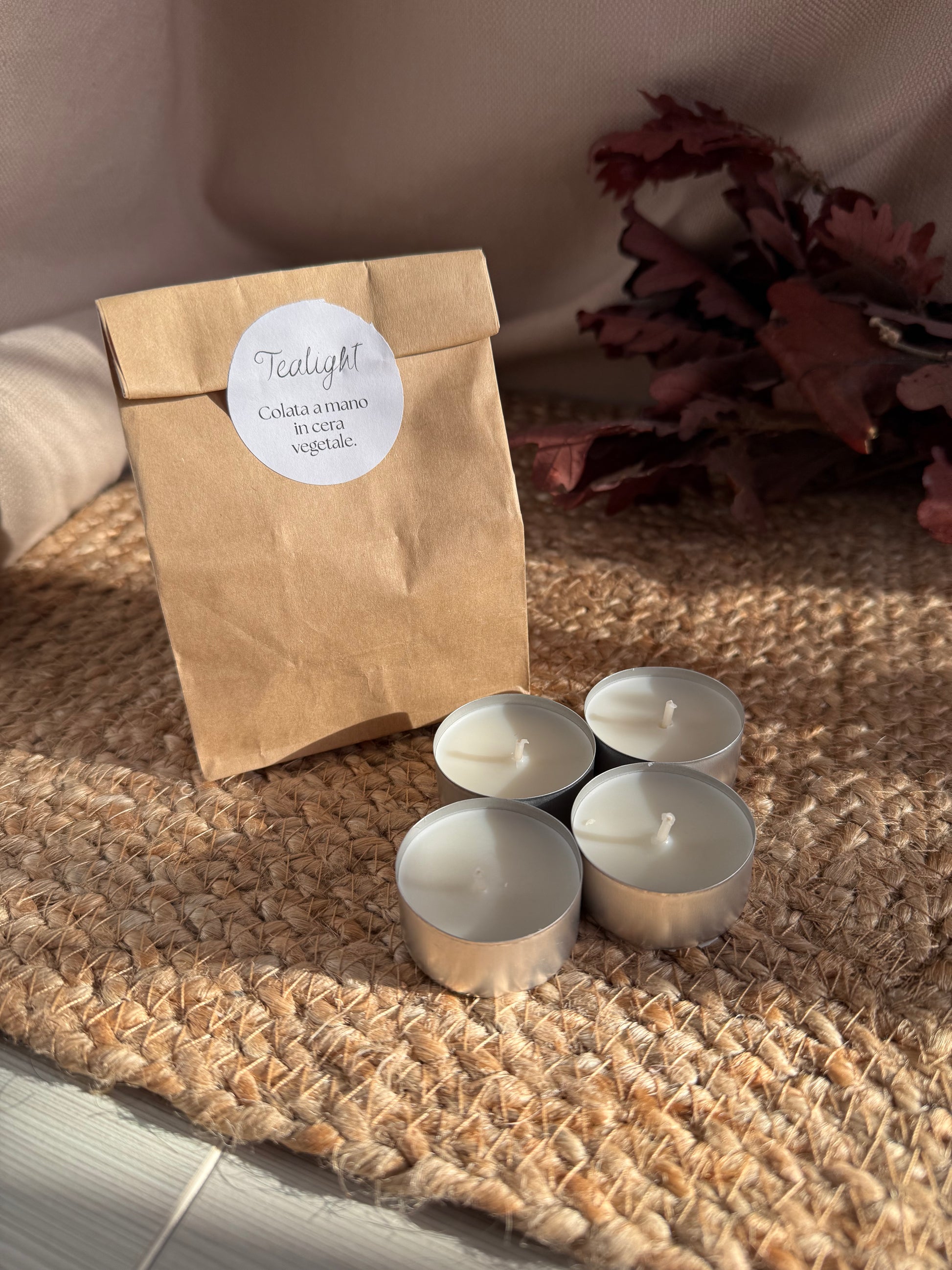 Box di tealight in cera vegetale colate a mano senza profumazione.